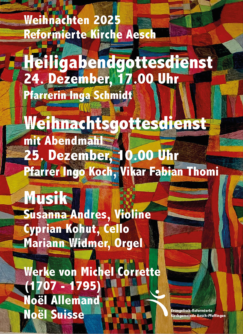 Die Gottesdienste am Heiligabend, 24. Dezember um 17 Uhr mit Pfarrerin Inga Schmidt und am Weihnachtsmorgen, 25. Dezember um 10 Uhr mit Pfarrer Ingo Koch und Vikar Fabian Thomi werden musikalisch gestaltet von Susanna Andres, Violine, Cyprian Kohut, Cello und Mariann Widmer, Orgel. Wir laden Sie herzlich zu den beiden Gottesdiensten ein.
